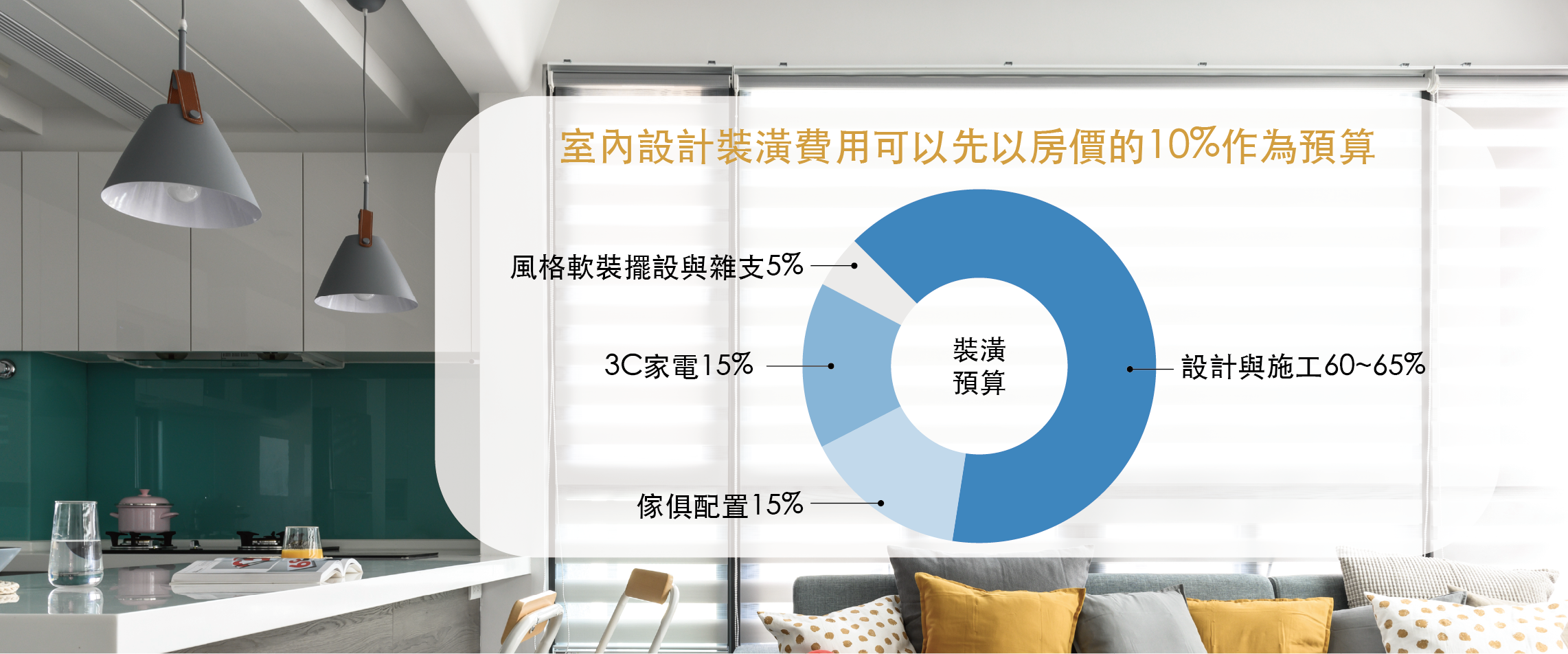 雖然預算比例較小,這是讓居家空間更有溫度的重要環節,包含窗簾布藝、牆面裝飾、生活家飾品和綠植盆栽等。