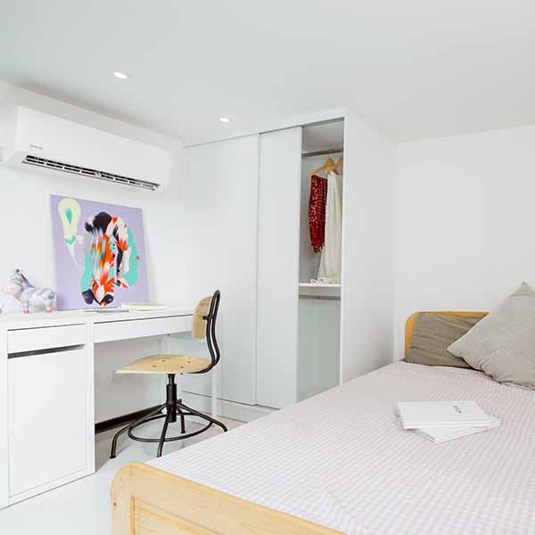 重視空間比例感:選擇與主色調協調、高腳懸空設計的傢俱,且不會影響整體動線,視覺上輕盈不壓迫。
