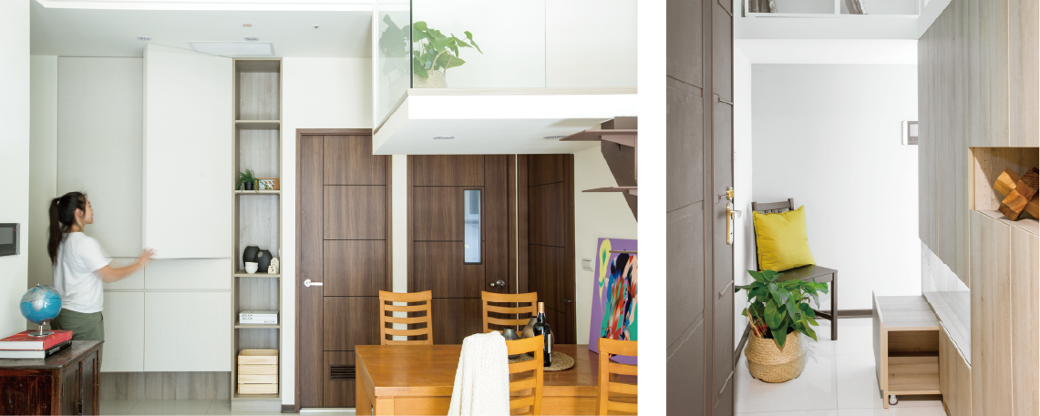 小坪數空間非常推薦將廚房、客廳、書房、休憩區等空間做一定程度的開放式設計,能讓空間顯得通透。將較少使用的場域融合進日常活動區域,簡化多餘的動線,立即感受到空間放大的視覺效果。