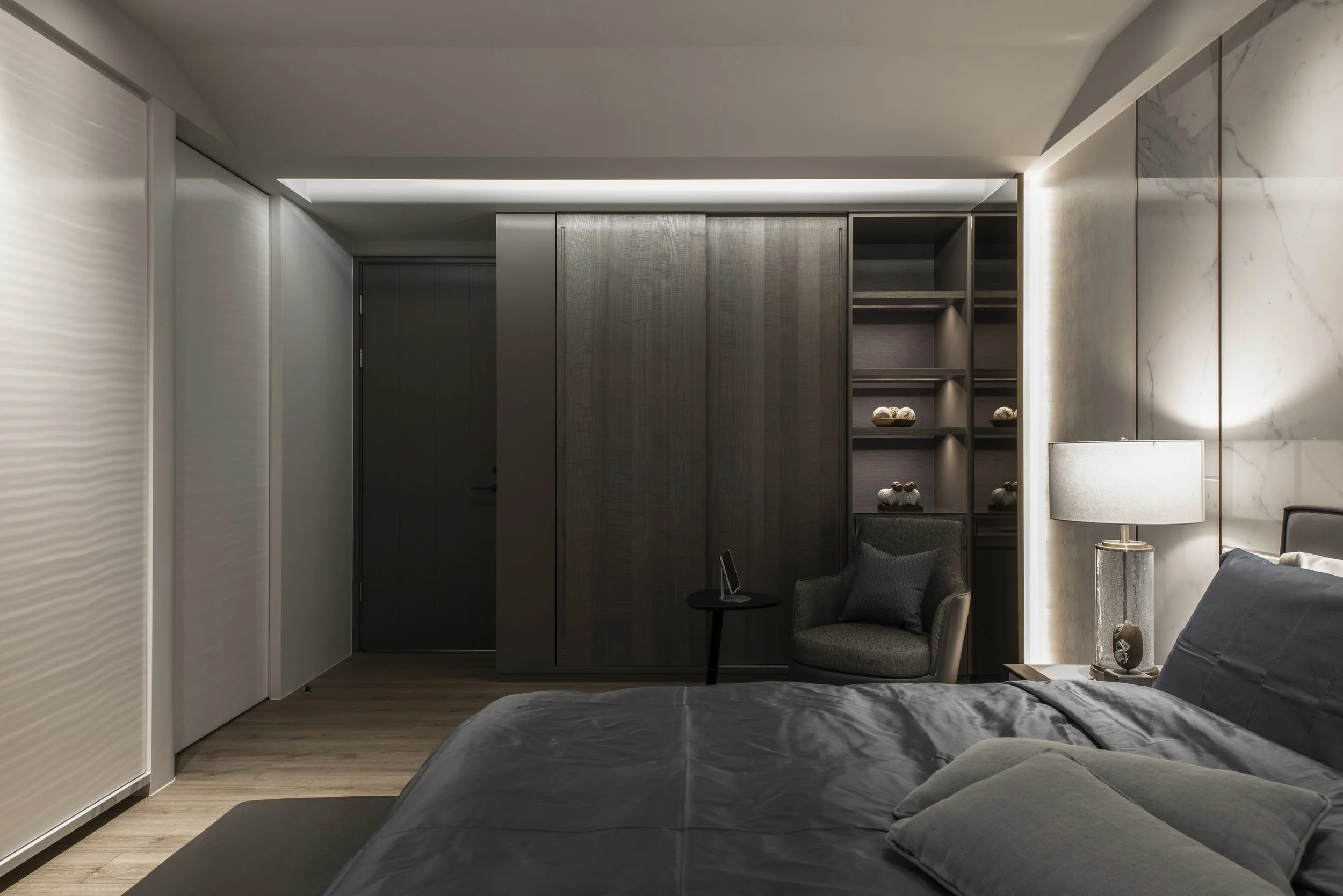 燈光遠不止是功能性照明,還能用來強調設計細節,是創造氛圍的利器。精心佈置的光線能放大傢俱的質感,讓皮革沙發的細膩觸感與原木辦公桌的自然溫潤更加鮮活、生動。進一步提升空間的質感與奢華氛圍。