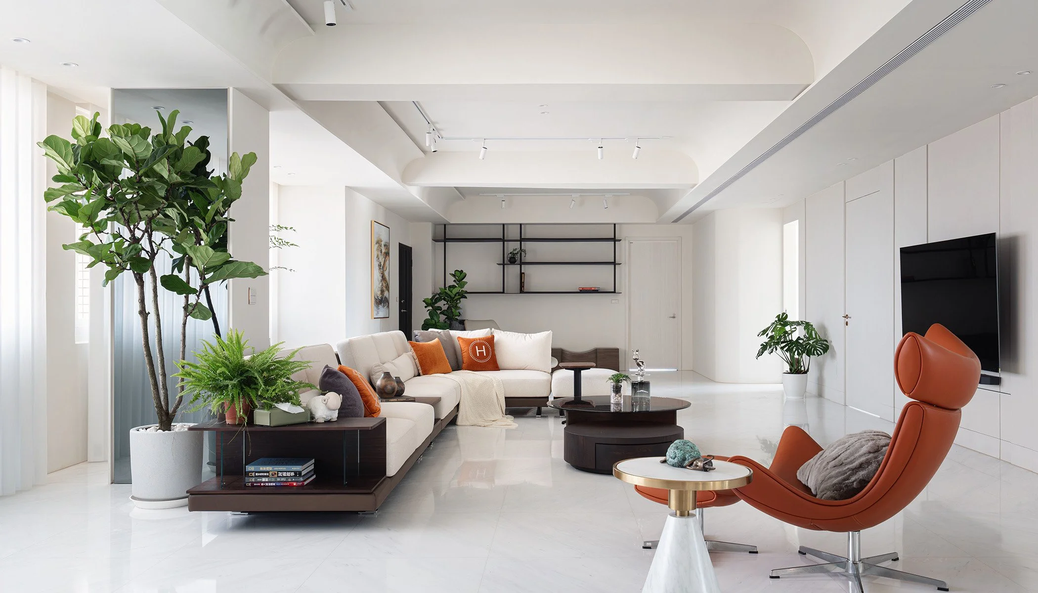 在群峰聯創的『靛然晨曦|寬廣輕奢純粹宅』的這個住宅設計案例中,在淺色調為主的空間中,我們利用了靛藍及丹橘色作為亮點色,打破單一色調的沈靜,為空間增添層次感與視覺驚喜。